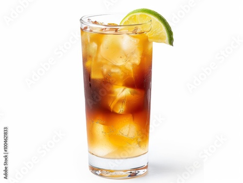 A dark and stormy cocktail in a highball glass with a lime wedge on a white background