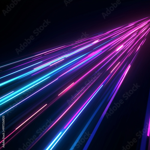 A dark background with vibrant neon light trails in shades of blue, purple, and pink