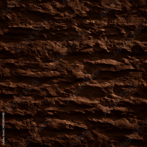 A dark brown, rough textured surface with distinct horizontal layers and variations in depth, resembling a natural rock face or stone wall