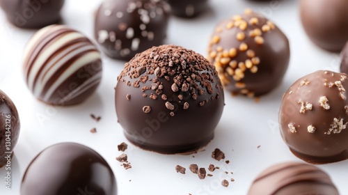 A dark chocolate truffle, its glossy surface adorned with a rich, molten cascade of chocolate that oozed down its sides, rested gracefully amidst other truffles on a pristine white background, a