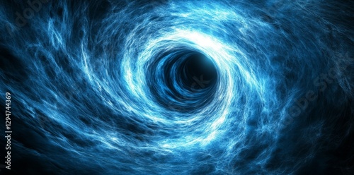 A dark circle at the center is encircled by varying shades of blue, creating symmetrical, crescent-shaped patterns. The artwork has a futuristic, abstract quality, emphasizing light and shadow