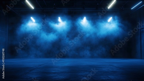 A dark empty street, dark blue background, an empty dark scene, neon light, spotlights The asphalt floor and studio room with smoke float up the interior texture. night view , ai