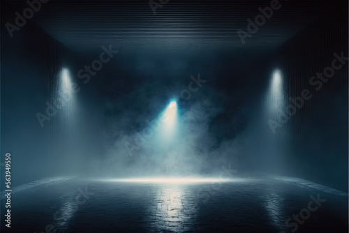 A dark empty street, dark blue background, an empty dark scene, neon light, spotlights The asphalt floor and studio room with smoke float up the interior texture. night view