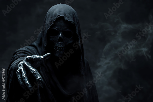 A dark figure in a hooded cloak reaches out, embodying a skeletal representation of death.