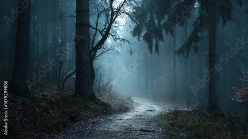 A dark forest path shrouded in mist, where mystery lingers in the soft light.
