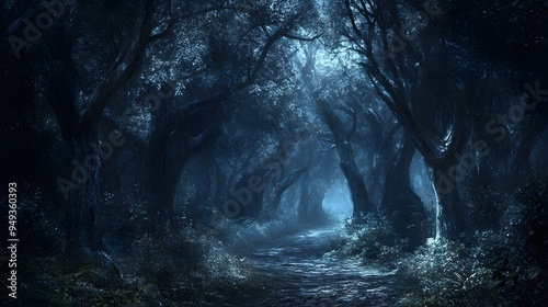 A dark forest with exaggerated shadows and deep dark colors