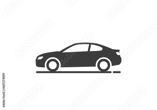 A dark gray car silhouette with white wheels on a white background in side profile
