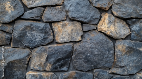 A dark gray, smooth wall background with a rough stone texture, captured in close-up, showcasing the intricate details and contrasting surfaces for a textured, natural appearance