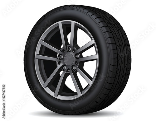 A dark grey alloy wheel with a black tire, isolated on a white background