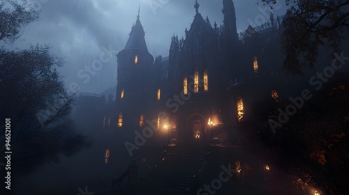 A dark mansion with intricate gothic architecture glowing windows and detailed Halloween decorations shrouded in a misty atmosphere