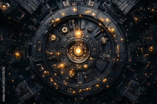 A dark metallic circular structure with intricate details and glowing orange lights inside it