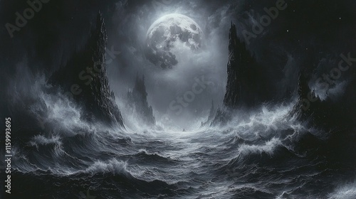 A dark, moody seascape under a full moon, featuring turbulent waves and rocky silhouettes.