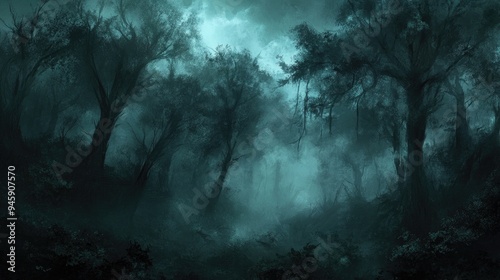 A dark, mysterious forest with fog rolling in, creating an eerie atmosphere with towering, shadowy trees.