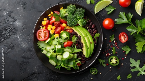 A dark plate showcasing a mix of black beans, corn, avocado, and tomatoes, topped with cilantro-lime dressing, presented elegantly with the vibrant colors standing out against the background,