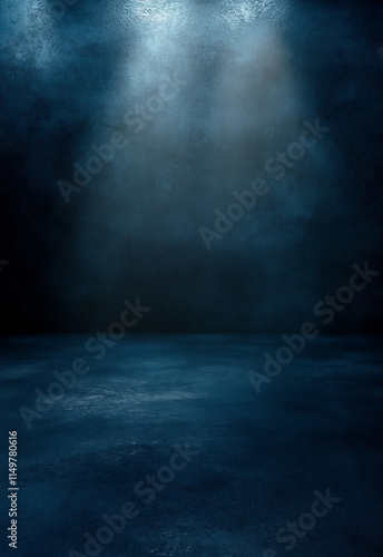 A dark room with a blue wall and a light shining on it Mysterious dark atmosphere with fog and light reflections, perfect for creating dramatic and moody visuals.