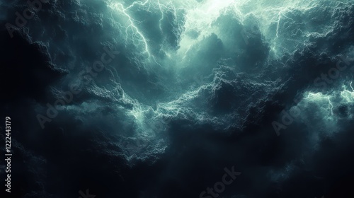 a dark, stormy sea with lightning and thunder, featuring large waves and a dark sky.