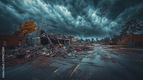 A dark, stormy sky over a collapsed building, symbolizing failure and devastation