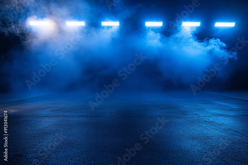 A dark street scene features an abstract dark blue background with a textured asphalt surface. Neon lights and spotlights cast dramatic glows, creating a moody atmosphere