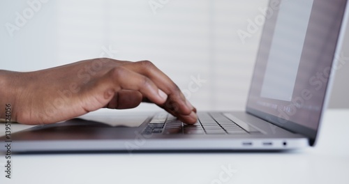 a dark-skinned guy in a light shirt is slowly typing on a laptop standing on a white table hands close-up