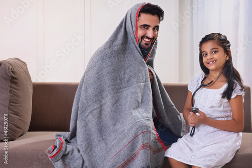 A DAUGHTER LOOKING AT CAMERA WHILE HAPPILY PLAYING AS DOCTOR WITH FATHER
