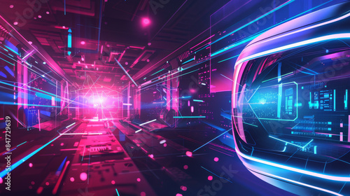 A dazzling array of neon lights and digital effects in a cybernetic corridor, viewed through the lens of a sleek VR headset, offering a glimpse into a high-tech future.