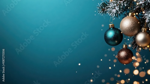 A dazzling array of ornaments in gold and blue, suspended from a snow-dusted pine tree, illuminated by soft glowing lights against a blue background.