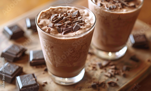 A decadent chocolate milkshake made with vanilla ice cream, chocolate syrup, and whipped cream. The milkshake is topped with chocolate shavings and served in a tall glass.
