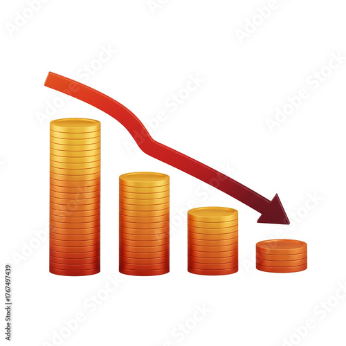 A declining bar graph with red arrow pointing downwards, representing financial loss and economic downturn isolated on transparent background