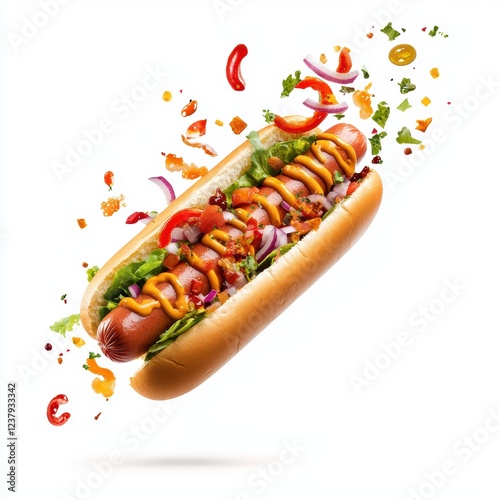 A deconstructed hot dog mid-air with its ingredients and colorful condiment splashes, isolated on a white background