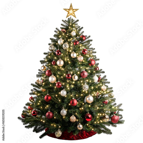 A decorated Christmas tree with lights, ornaments, and a shining star on top, isolated on a white background