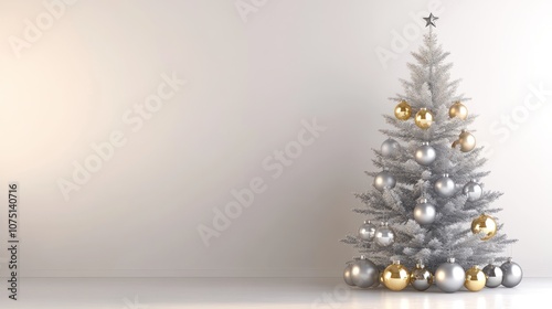A decorated silver Christmas tree with gold and silver ornaments against a plain background.