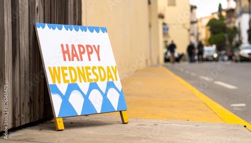 A decorative A-frame sign with "Happy Wednesday" on a street sidewalk.