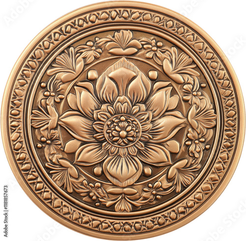 A decorative, circular medallion featuring intricate floral designs and a central lotus motif on white background, crafted in a bronze-like finish. cut out.