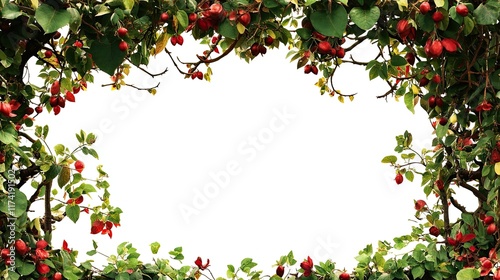 A decorative frame of green leaves and red berries surrounding a blank white space.