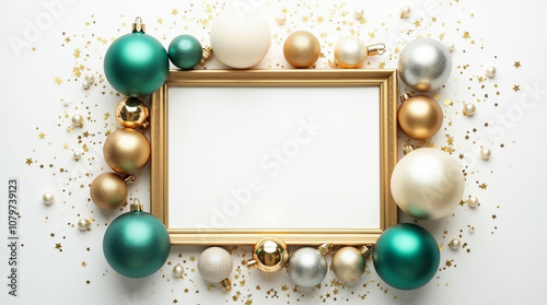 A decorative frame sits at the center, surrounded by vibrant holiday ornaments in green, gold, and silver, perfect for Christmas designs or festive messages.