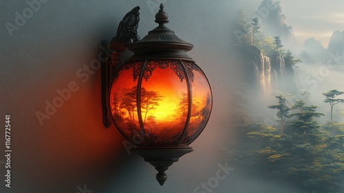 A decorative lantern casting a warm glow, featuring a scenic landscape within its design.