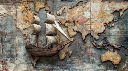 A decorative map featuring a ship sculpture against a world map backdrop.