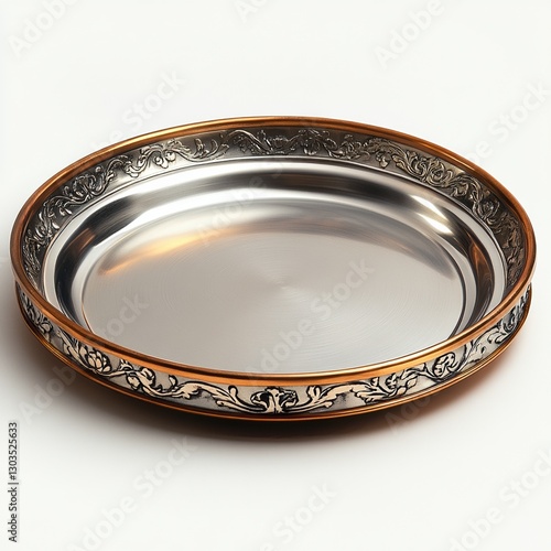 A decorative serving tray with a polished silver surface and an ornate copper and silver rim featuring intricate floral patterns.