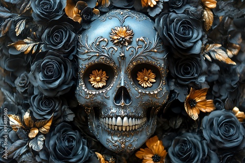 A decorative skull surrounded by dark roses and golden flowers, symbolizing life and death.