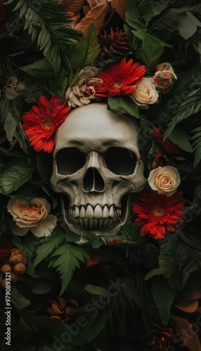 A decorative skull surrounded by vibrant flowers and lush foliage, symbolizing the juxtaposition of life and death.