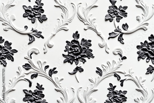 A decorative wall design featuring embossed floral patterns in black and white, creating a classic and elegant aesthetic.