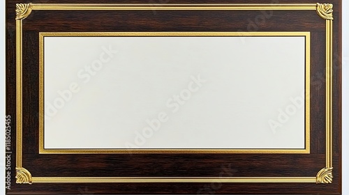 A decorative wooden frame with gold accents, featuring a blank white center, suitable for displaying artwork or photographs.