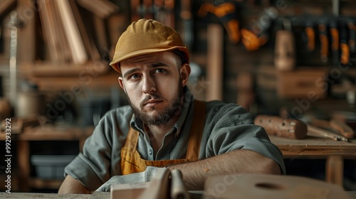 A dedicated carpenter in his uniform, sitting comfortably in his workspace, surrounded by tools and wood, showcasing craftsmanship and passion for woodworking