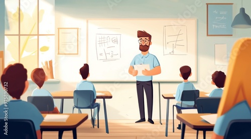 A dedicated teacher engages a lively classroom of young students during an interactive lesson on a bright afternoon, surrounded by educational charts and a warm atmosphere