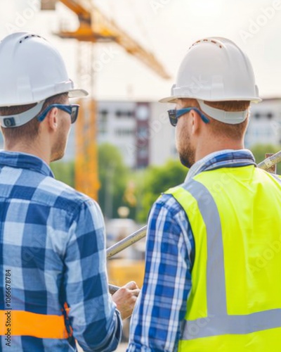A dedicated team of builders work together, skillfully assembling scaffolding at an active construction site, surrounded by heavy machinery and vibrant daylight.