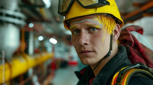 A dedicated young worker in a helmet and safety goggles stands confidently in an industrial setting, embodying concentration and readiness for the task at hand.