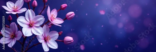 A deep blue-purple background complements the delicate white flowers, petals, purple