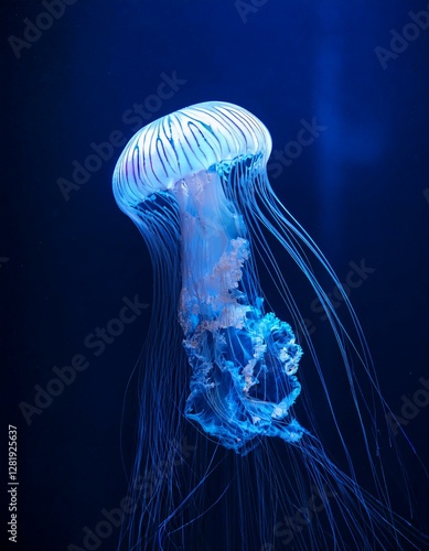A deep-sea jellyfish floating in the dark ocean, emitting a hypnotic neon-blue glow