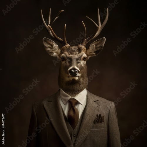 A deer dressed in an elegant tuxedo with a top hat and bow tie, exuding sophistication and class, standing against a dark, textured background