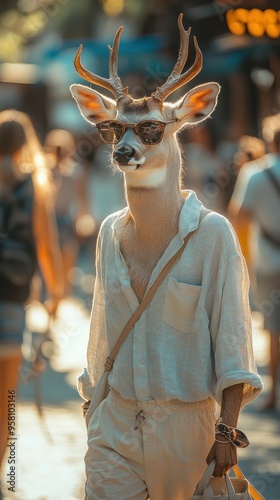 A deer with sunglasses and a white linen shirt walks down a busy street.